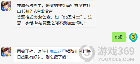 在原著漫画中,米罗的猩红毒针有没有打出15针?答题格式为da答案,1月12日圣斗士星矢每日一题的答案是什么?不知道的斗士们,进来看看正确答案吧!回答正确即可领取雅典娜为大家准备的丰厚奖励了