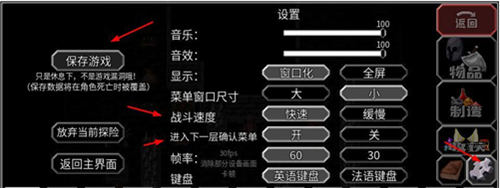 需要注意的是,存档保存的数据会在角色死亡之后被覆盖。另外建议开启“进入下一层确认菜单”的选项,因为如果不小心点了进入下一层,就必须将里面的怪全部刷完才能出来存档,很容易翻车。