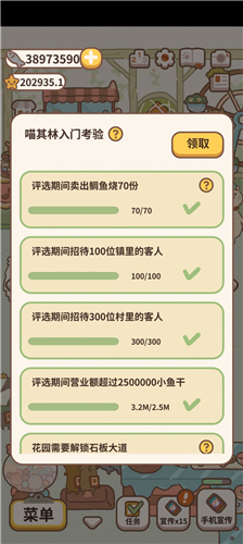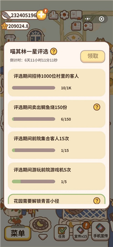 1、任务要求:评选期间招待1000位村里的客人,评选期间卖出鲷鱼烧150份,评选期间前院集合客人15次,评选期间游玩前院游戏机7次,花园需要解锁青苔小径等。