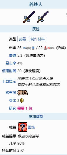 首先我们知道养蜂人是一把可以召唤蜜蜂的剑,那么蜜蜂在泰拉瑞亚手游中,只有蜂王才有,所以我们需要召唤蜂王出来,然后击杀蜂王就可以掉落,这个掉落是有几率的,几率很高,有三分之一的掉落几率,而且养蜂人攻击是有几率会让敌人获取减益效果。养蜂人所召唤的蜜蜂造成 8-9 伤害,装备蜂巢背包时蜜蜂可能造成 1-4 点额外伤害。