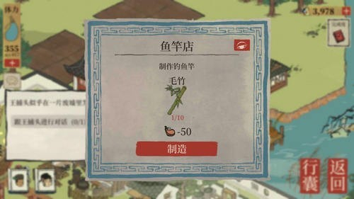 作为消耗品的鱼竿,玩家可以在码头旁边的鱼竿店消耗毛竹制作获得,制作1根鱼竿需要10个毛竹和50点体力。