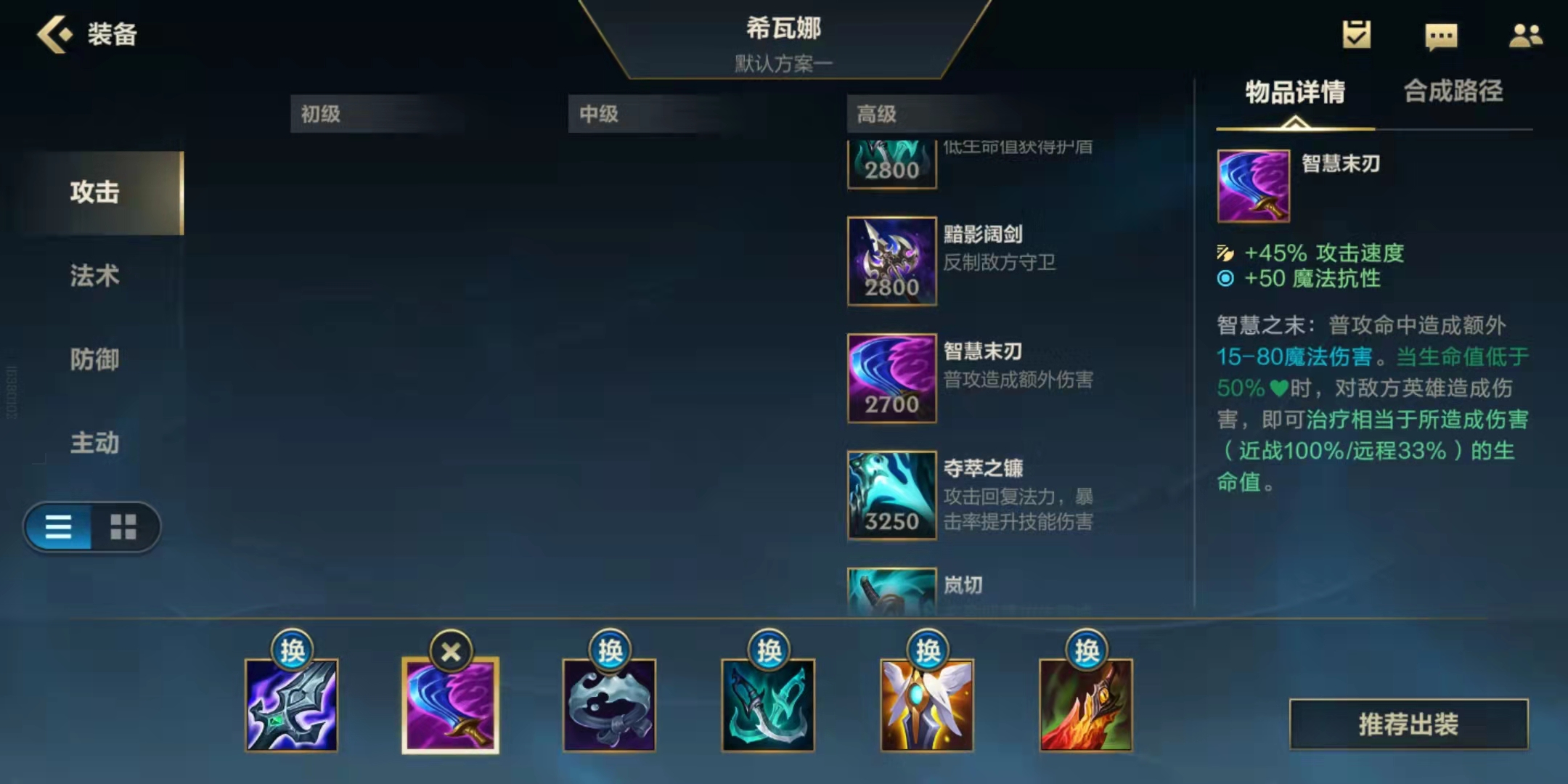 开局出门装先买长剑,有经济之后,优先出破败+黑切+水银+无尽+复活甲+死亡之舞,发生较大改动的是智慧抹刀,之前版本是增加生命值低于50%时候增加%百分百的治疗量。