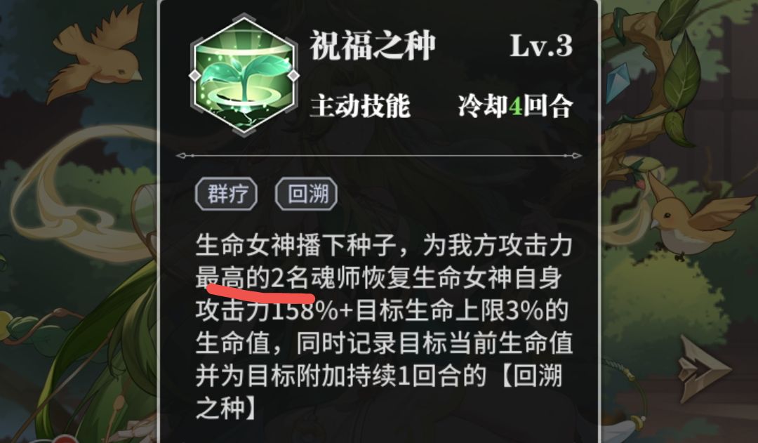 2、生命之女的技能回复增益主要局限于攻击力最高的两名魂师,无论是护盾还是生命回复,以及各种增益效果,有点顾头不顾脚,使全队的恢复不均衡,因此生命之女单挂队伍会导致除输出以外的魂师容易掉点。