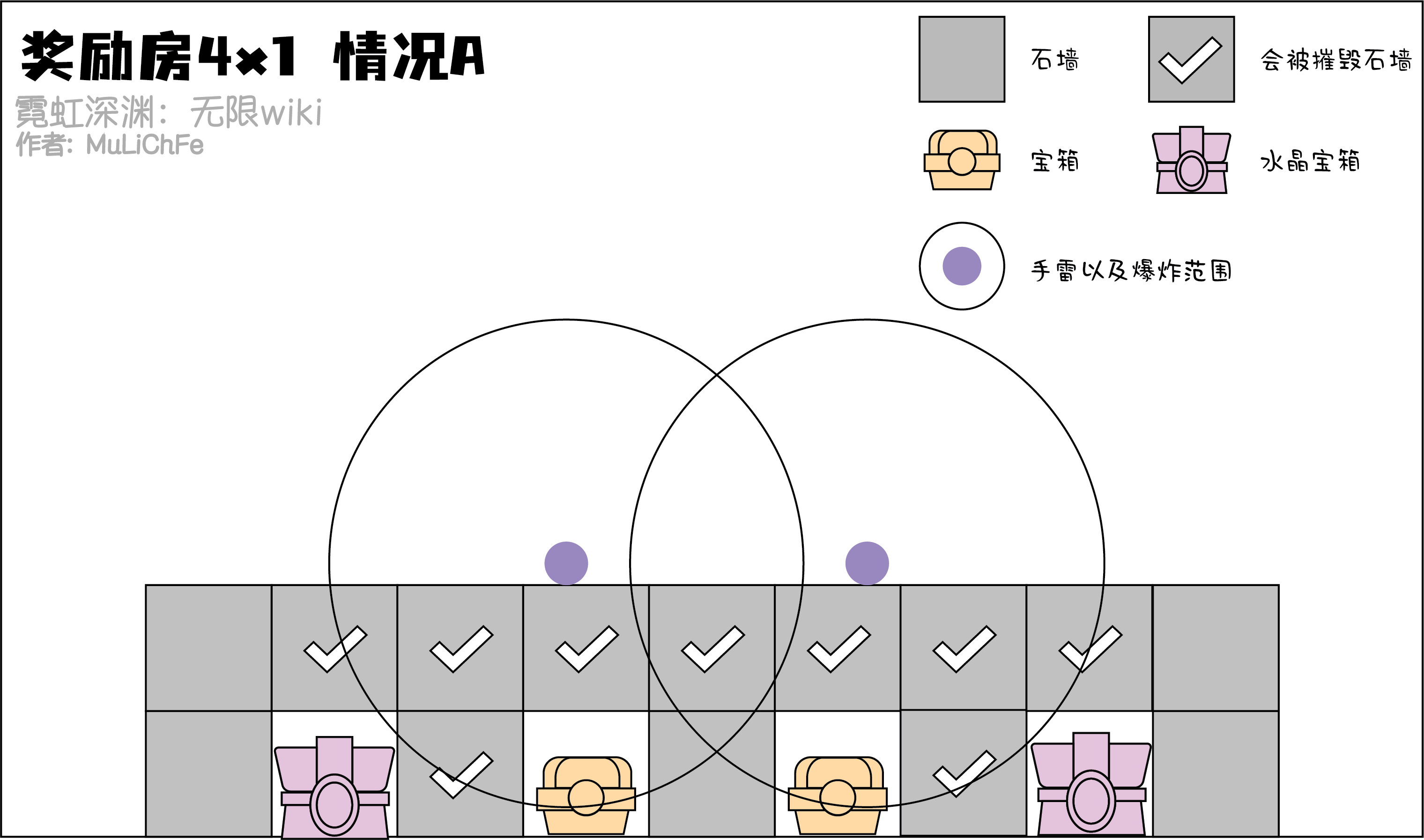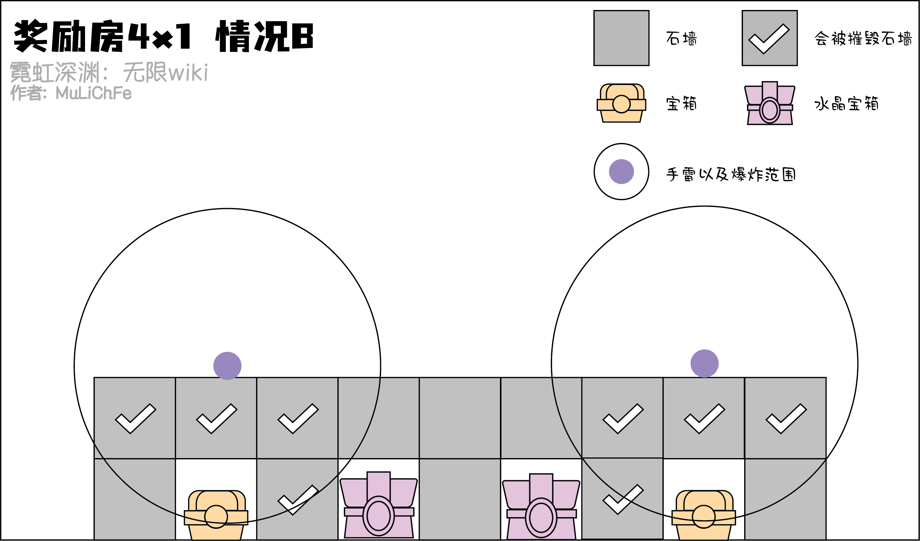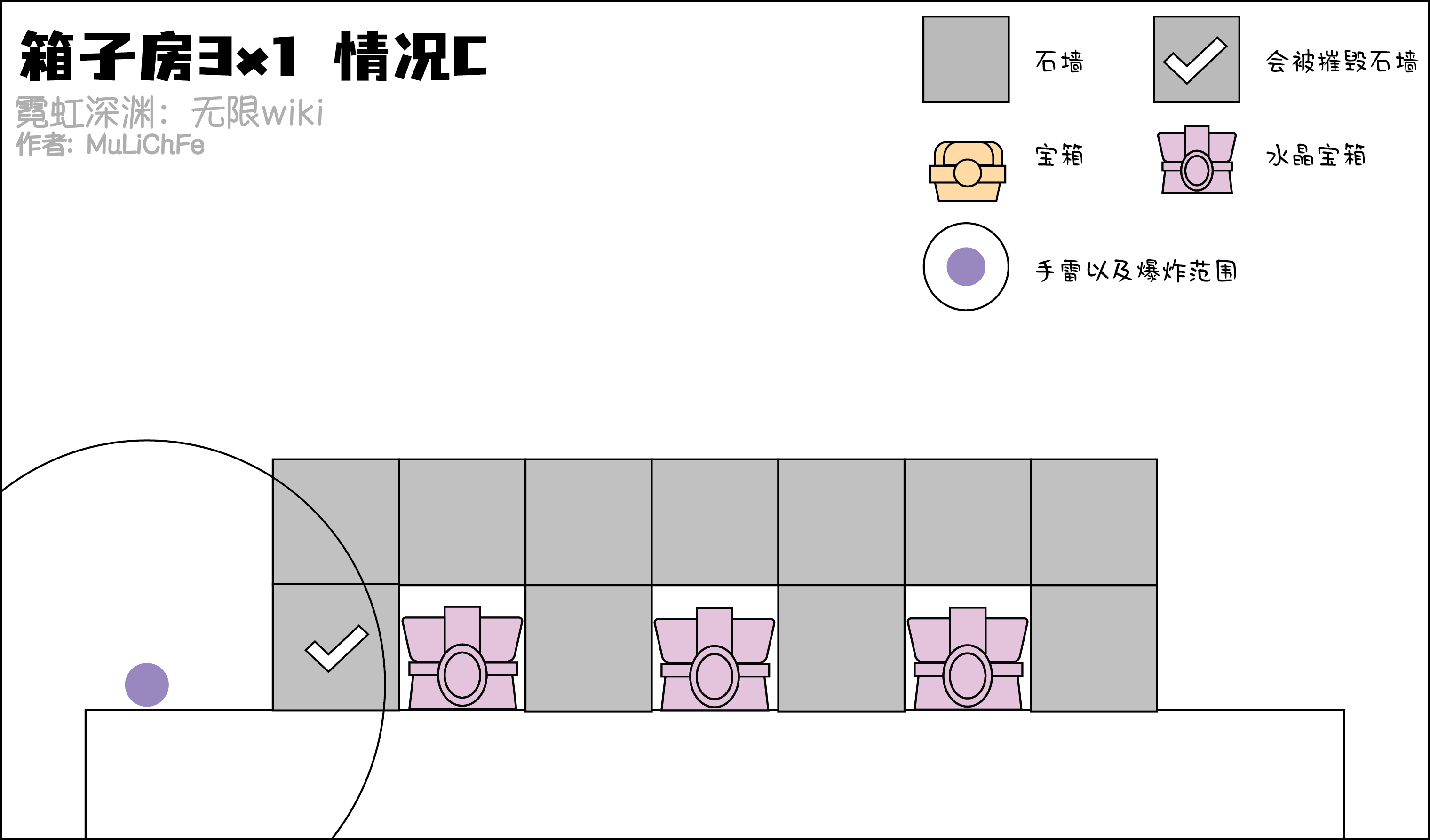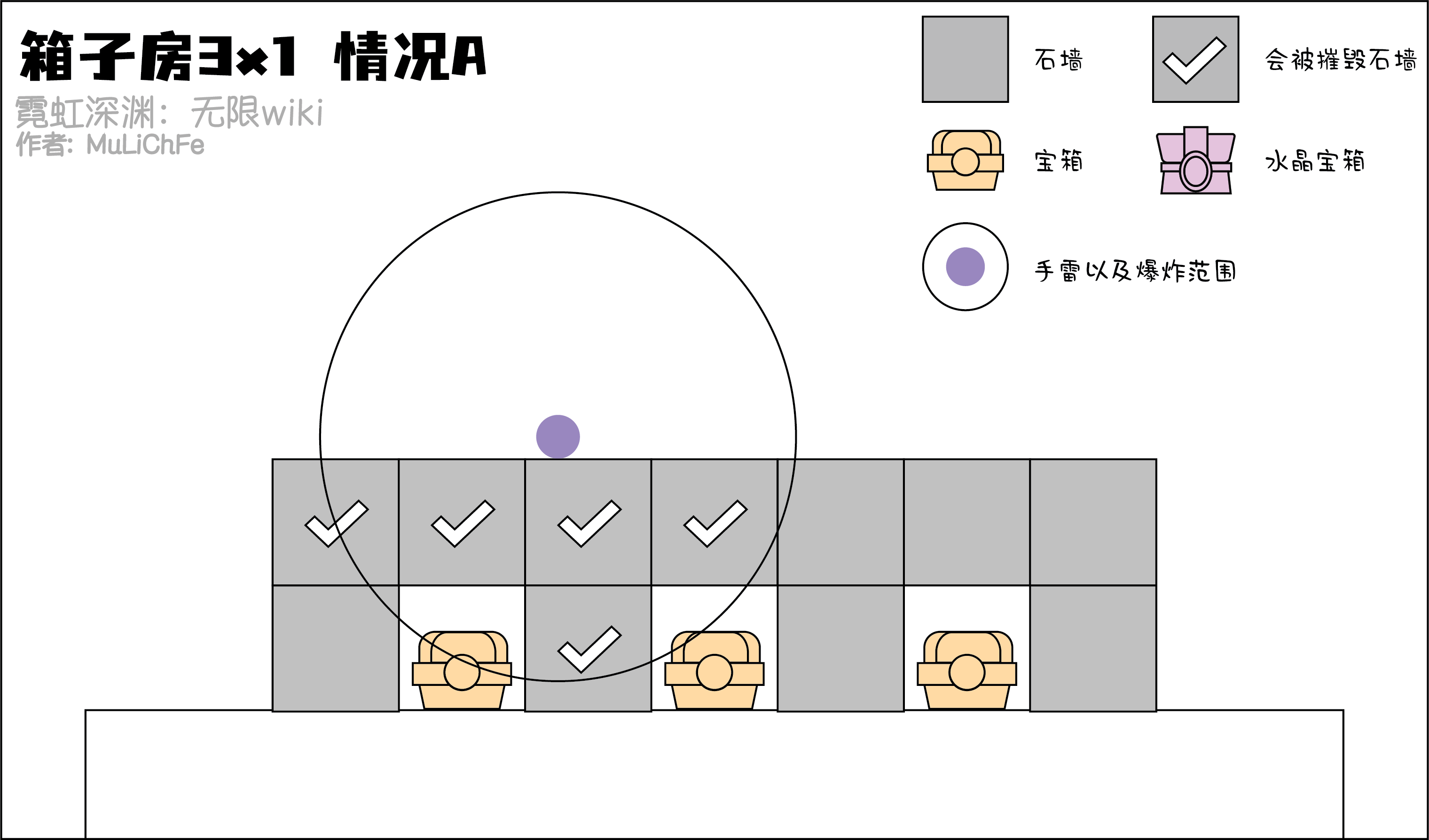 下面是各种常见的箱子房间,虽然并不是全部(也不可能列举出全部)。但是对比下列各种情况可以快速的了解应对各种情况的方法。当然实战中不一定全是箱子,这里就以箱子为例。水晶箱子无论接触到了多少爆炸范围都会变红,这里提供了不同的思路去解决。