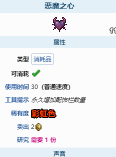 泰拉瑞亚恶魔之心是一件专家模式和大师模式独有的消耗品物品,可以在血肉墙的宝藏袋中找到。它会永久为玩家提供一个仅能在专家和大师世界中使用的配饰栏。此效果不会叠加,每个人物只能使用一次。如果玩家在已经使用恶魔之心的情况下打开血肉墙的宝藏袋,不会再次获得一个恶魔之心。