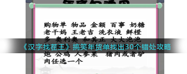 以上就是汉字找茬王搞笑年货单找出30个错处攻略的全部内容了,就算没有什么问题,也可以常来本站手游攻略频道看看哦,万一能够收获到很多意料之外的惊喜呢!