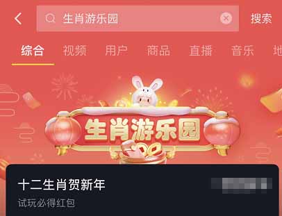 1、打开抖音,点击右上角【搜索】按钮,输入“生肖游乐园”进入即可。