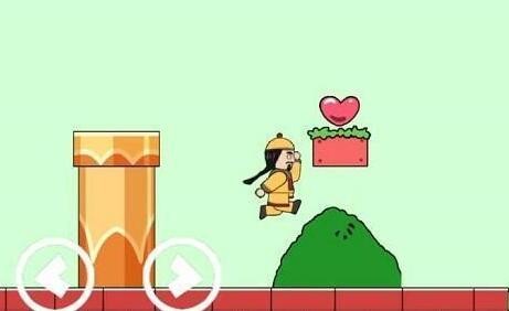 2、接着就会来到一个超级玛丽的小游戏中,在这里跳到第二个烟筒的后面,在树堆中间的位置向上跳一下就会有一个爱心。