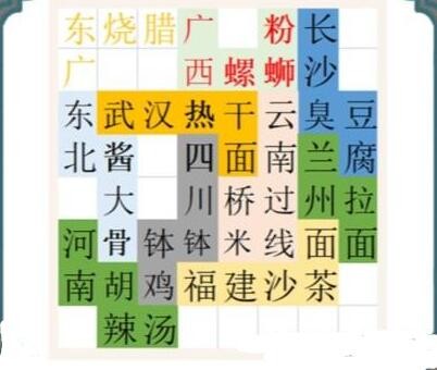 进击的汉字合成所有美食有广东烧腊、广西螺蛳粉、长沙臭豆腐、东北酱大骨、武汉热干面、云南过桥米线、兰州拉面、福建沙茶面、四川钵钵鸡、河南胡辣汤。
