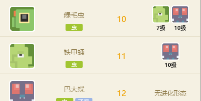 又比如绿毛虫在7级的时候可以进化为铁甲蛹,10级的时候又可以进化为巴大蝶;
