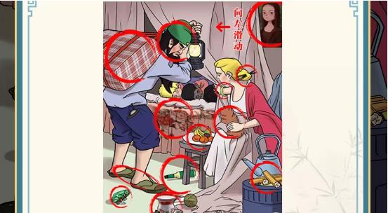 4、右边的人头上插着筷子,手上是玉镯,手里拿着鸡毛掸子,向左滑动右上角的画,可以找到国产制造