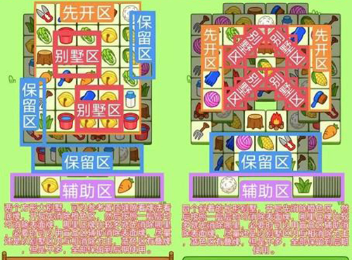 2.开局先消除橙色区的牌,这里压牌。尽量要让牌面保持在同一水平面,然后一层一层消除表面牌,不要跨层太多拿牌,等表面牌消除完后,以大别墅内互相消除为主。