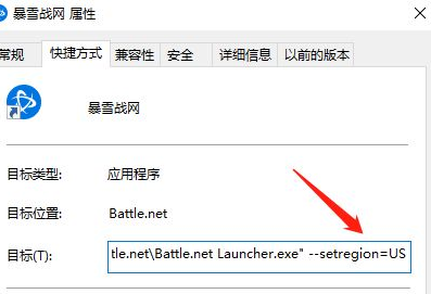 如果只有中国的选项,先把战网关闭(很重要),然后右键战网选择属性,在目标一栏中添加“ --setregion=US”,注意有一个空格哦,示意图如下。