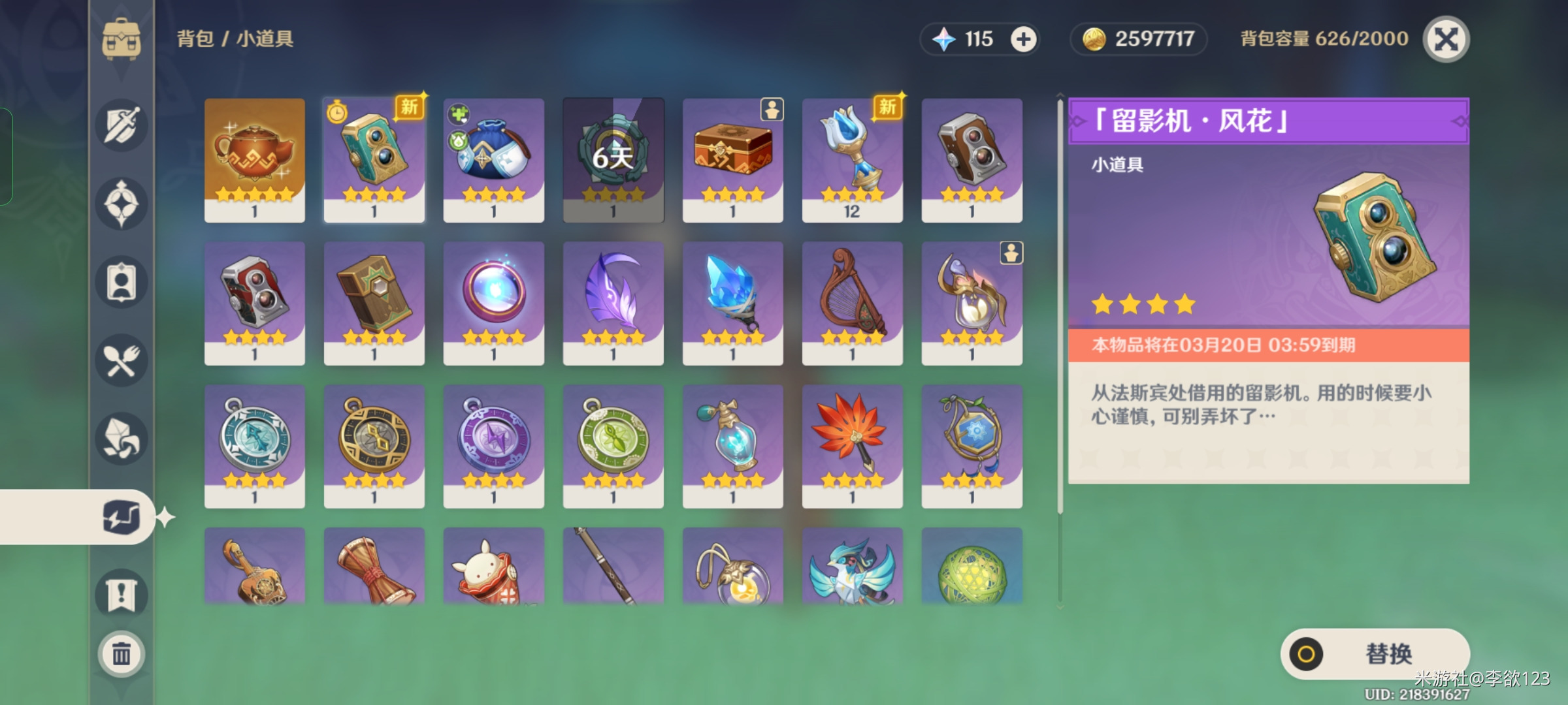 拍摄之前,需要装备小道具「留影机·风花」,注意物品将在03月20日03:59到期