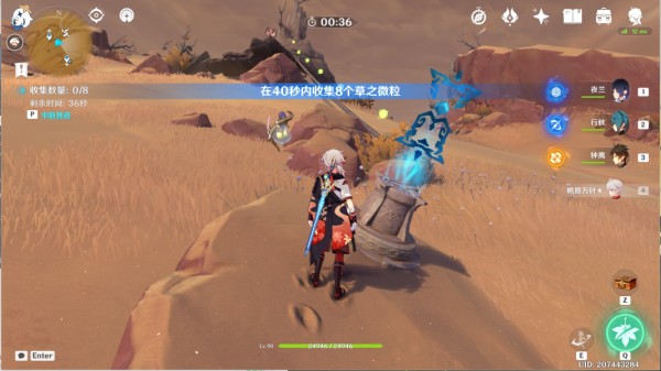 2、传送三运河之地西北方向锚点,往地图的东南方向走,来到山坡上在40秒内收集8个草之微粒。