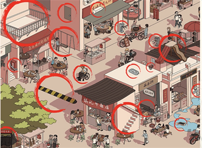 2、图中左边有一个【阳台】,下面墙上是【消防栓】,路上有【加速度】,前面的人坐在【脚踏轮椅】上,中间店铺上面有【空调】,门口是【闸机】,右下角水中有【排水口】,店外有【扣题】,屋顶上是【滑滑梯】。