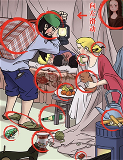 2、图中左边的人是【关羽】,他背着【蛇皮袋】,地上有【青蛙玩具】、【花露水】,【火柴盒】,床上是【牡丹花】床单,右边的人头上插着【筷子】,手上是【玉镯】,手里拿着【鸡毛掸子】,向左滑动右上角的画,可以找到【国产制造】。
