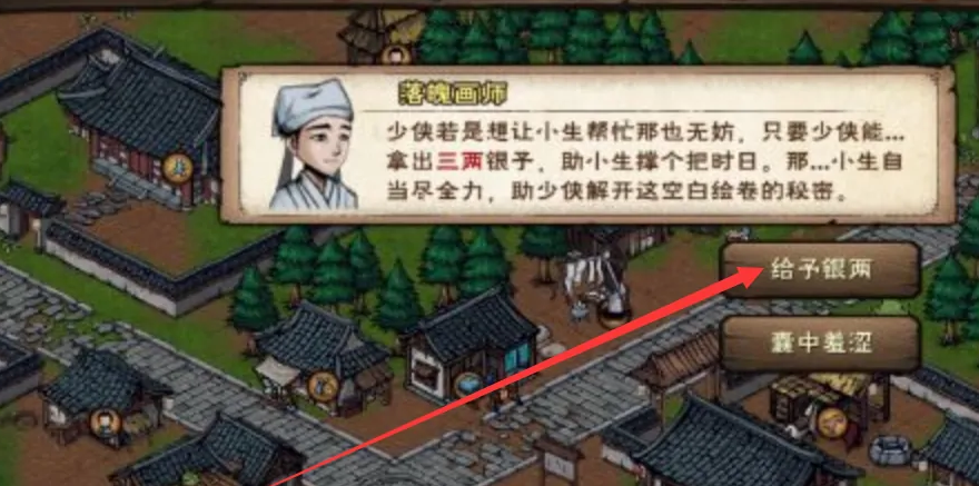 想要让落魄画师帮我们解开画中的谜题,我们就要给他银子。给完画师银子之后我们只需要等待就可以了,可能等待的时间就是画师解谜的时间吧。等待完毕之后我们再次去找画师,然后选择画卷之谜,继续跟落魄画师对话,对话完毕之后任务也就完成了。