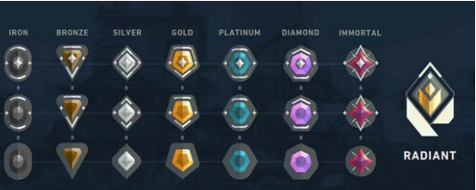 无畏契约中8大段位分别以英文名称定义,分别为:Iron、Bronze、Silver、Gold、Platinum、Diamond、Immortal、VALORANT等的8种段位而玩家在排位赛的对局中个人的表现也是会对最后的加分情况有着十分关键的影响