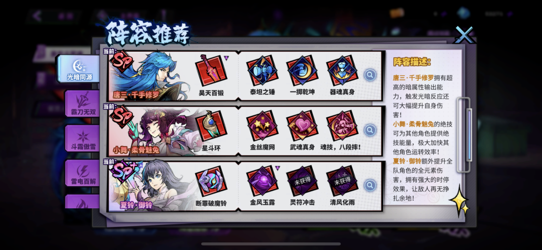 唐三·千手修罗:光暗队的主C,通过核心技能【气刃斩】可以造成大量伤害,通过切换上场触发光暗反应还能大量提升自身伤害