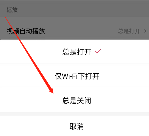 3、在设置界面中点击短视频自动播放会弹出操作界面,点击总是关闭就可以了。
