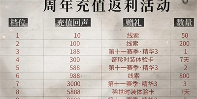 侦探们在此期间充值回声即可获得包含周年庆精华、稀世时装体验卡、奇珍时装体验卡等在内的奖励。