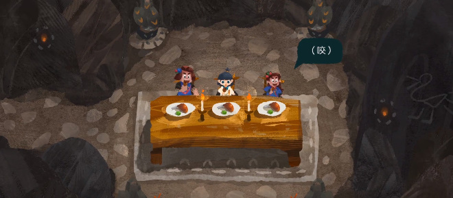 7、在第三个火山上面它就会掉下去,然后我们从旁边的楼梯下去,还可以获得一个拼图;然后就可以开始吃饭了;