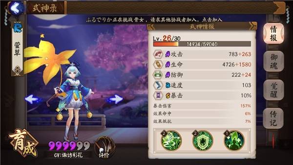 推荐御魔:萤草是少有的御魔带法多元化的奶妈。一般向带法还是树妖4件套+15%攻击2件,非常的万金油,奶量也十分充沛。而还可以狰4件套+15%攻击,狰本身2件套的效果就是15%攻击加成可以提升奶量,而4件套的效果是概率反击,也就是触发反击会回一次血,而被动会回一次血形成双回,此种配法在斗技或者结界突破中更为常见,可以保证你想集火打死萤草却怎么也打不死。另外还有一种很冷门的带3套+15%攻击的御魔而舍去4件套效果来极限堆攻击,可以能打能奶。