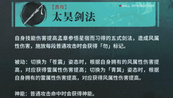 技能三:当自身神能满值时,孟章则可使用技能三切换为「苍震」姿态,使用攻势更为凌厉的雷属性剑术,其特点为剑招变化,