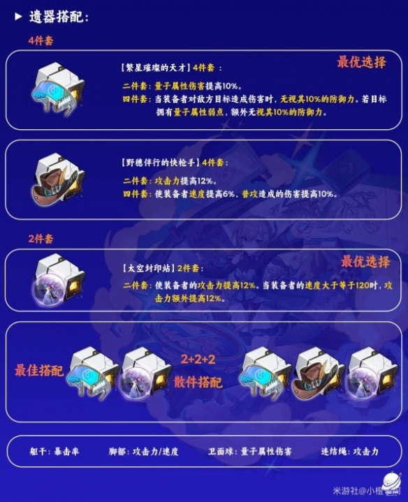 ①「青雀」最优搭配就是【繁星璀璨的天才】4件套+【太空封印站】2件套。