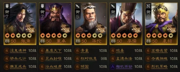 群雄我认为是策划有意在S1抬的强度,因为群雄实在是太超模了,但是群雄也因为98张角预选华佗而变得不那么的昂贵。群雄三个核心武将,董卓张角华佗,都是单卡强度爆表以至于超模的卡,所以顶配的群雄是必带这三个武将的,那么剩下两个武将我认为是李儒和袁绍。
