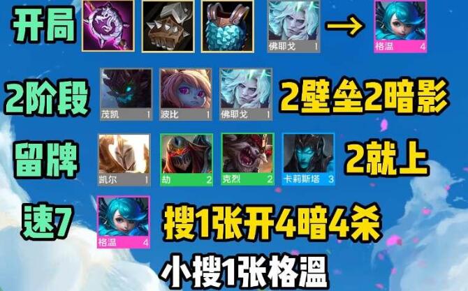 开局2壁垒2暗影岛,前期装备的话我们就给佛耶戈打工,天使、劫、克烈、卡莉斯塔需要满足2星就可以了,速7后找格温,8级之后可以追三星格温。