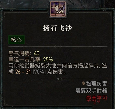 2.第二个技能比较核心,建议学习扬石飞沙,它可以提供高额的伤害,是我们在游戏中的主要输出手段之一,不仅可以造成aoe伤害,还可以出发狂暴,最先建议强化这个技能天赋。
