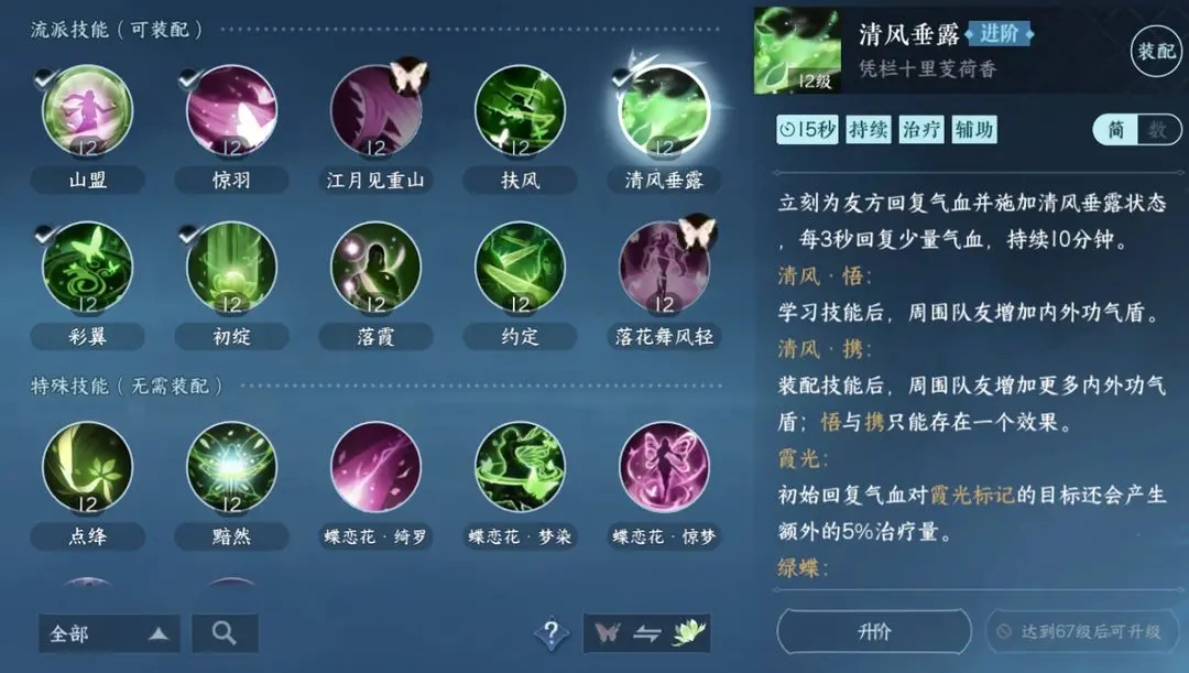 清风垂露:持续产生治疗效果的辅助型技能,可以为队友增加气盾值。