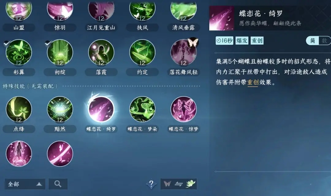 惊羽:单体伤害技能,命中可以获得一只蝴蝶。