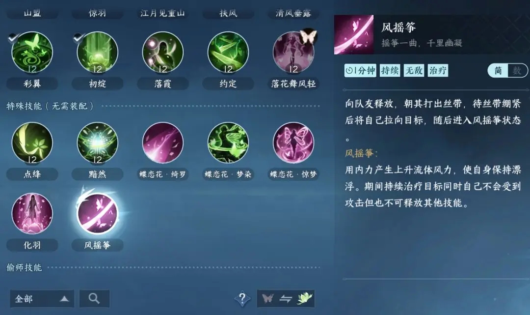风摇筝:带有位移效果的治疗技能,状态开启之后出于无敌状态但是不可释放其他技能。