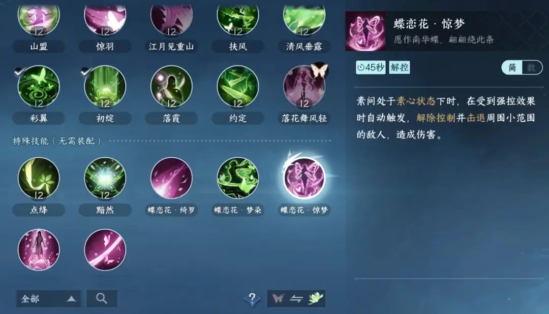 蝶恋花·惊梦:素心状态下自动触发,解除控制并且击退周围小范围敌人造成伤害。