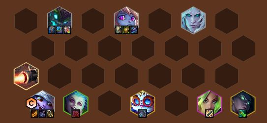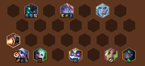 我们这套阵容是一套低费赌狗阵容,所以在阵容上相对于高费阵容强度需要靠挂高费卡补充质量。8人口只要能拿的高费卡都可以挂