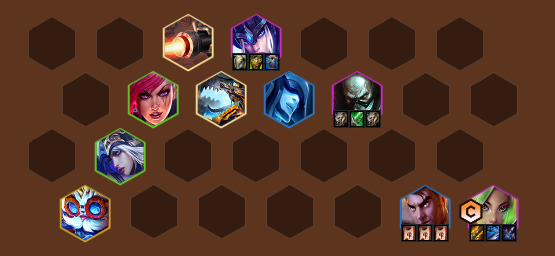 【祖安枪】需要开局【3皮城】养出高层数的【霸王龙】,或者是天胡【泽丽】上9级提高上限,否则登顶很困难。 阵容原理 【佛雷尔卓德枪手】的第一个核心点:【瑟庄妮】搭配【3弗雷尔卓德】,打出冰冻效果,只要【瑟庄妮】还存活,队友就能对受到【冰冻】效果的敌方造成【真实伤害】,破前排更快。另外【3弗雷尔卓德】还有【破魔】效果,延迟对对方2、3次施法。