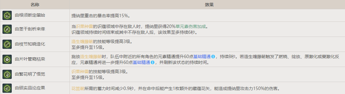 提纳里的每点元素精通,都会使其重击与造生缠藤箭造成的伤害提升0.06%。