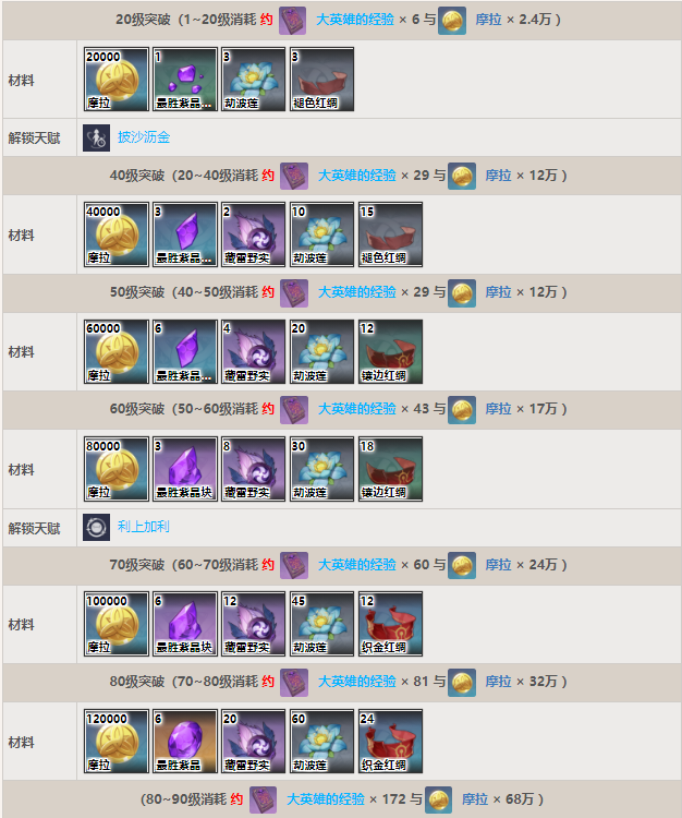 20级突破材料:20000摩拉、最胜紫晶碎屑*1、劫波莲*3、褪色红绸*3