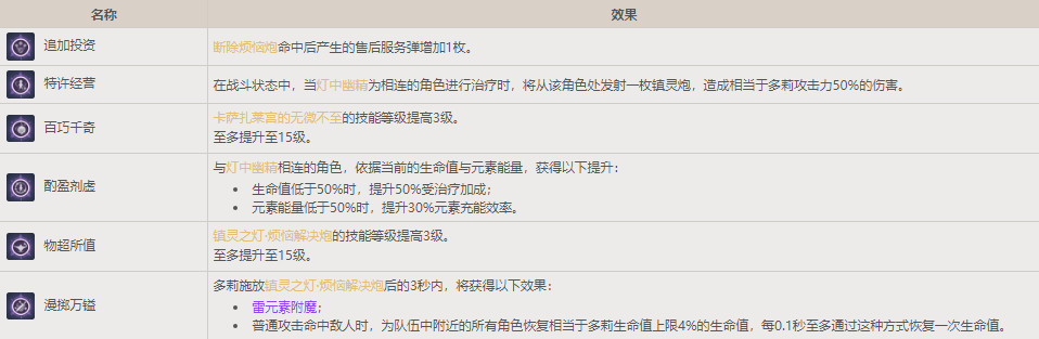 镇灵之灯·烦恼解决炮的断除烦恼炮或售后服务弹命中敌人时,基于多莉的元素充能效率,每100%为多莉恢复5点元素能量。