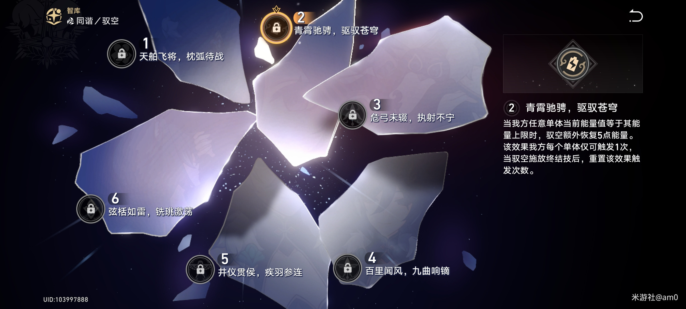 二魂:当我方任意单体当前能量值等于其能量上限时驭空额外恢复5点能量该效果每个单体仅可触发一次当驭空施放终结技后重置该效果触发次数