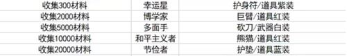 收集300-20000数量的材料即可解锁幸运星、博学家、多面手、和平主义者、节俭者