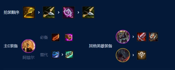 主C阿兹尔鬼索的狂暴之刃必备,23件从珠光护手、巨人捕手、斯塔缇克电刃、海克斯科技枪刃、破防者、大天使之杖里挑。辅助阿克尚在新版本中,技能可以触发斯塔缇克电刃,所以如果你英雄带德莱文,且一局里弓有多,则阿兹尔的装备尽量做的爆,阿克尚带斯塔缇克电刃和基克的先驱打辅助。
