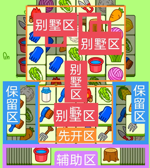 两个工字型大别墅,开局先消除橙色区,然后按照一层层均匀消除表面牌,哪里压牌比较多就先消除哪里,必要时可以用盲盒区辅助消除表面牌,尽量还是必别墅区内互相消除为主,蓝色区有叠牌,但是不多,全部保留到后期使用。