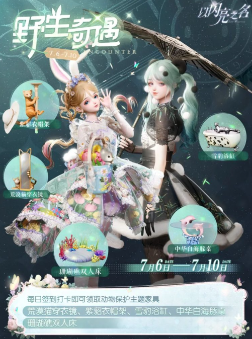 以上就是以闪亮之名野生奇遇活动的具体玩法了,每天都会解锁一份限定的联动家具,玩家7月6日至7月10日每天登录游戏,就能够免费领取动物保护主题联动家具,并且还能够看到很多少见的野生动物。更多的相关资讯可以关注本网站。