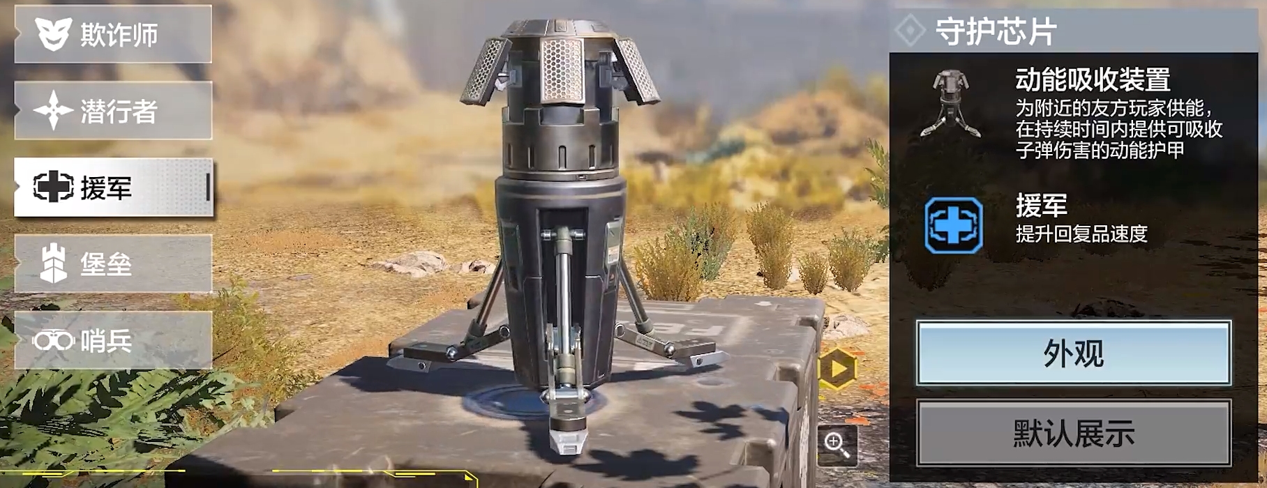 使用注能守护芯片后会在使用者身边安放一个装置,装置生成时扩散出一个动能吸收力场为附近的队友覆盖动能装甲。