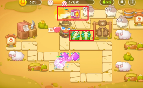 保卫萝卜4波仔很忙中的28关中出现了新角色-绵羊,绵羊虽然没有什么战斗力,但是它会吃掉我们的萝卜,所以我们要尽快的消灭绵羊,并且这一关中有两个方向出现敌人,难度是非常大的,让我们一起来看看这关要怎么玩才能够通过吧。