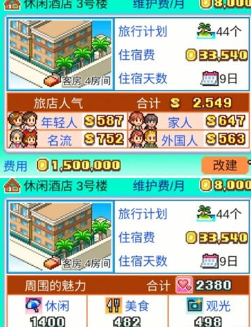 本作的魅力有四种:休闲魅力、美食魅力、观光魅力和生物魅力,界面右上角显示的是总魅力,总魅力越高来客量就越多(魅力对到访人数的提高有上限,上限大概是2w+魅力)